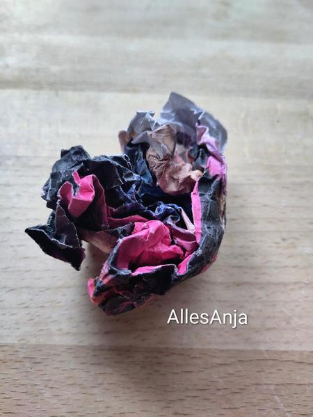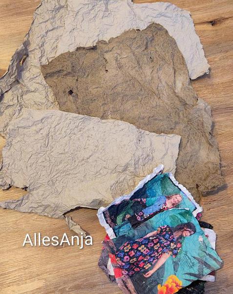 November - Momigami... geknetetes Papier. Eine alte japanische Technik, von der ich bisher nichts gehört hatte. Ich habe ein bißchen rumprobiert. Mit purem Papier. Mit Papier mit Olivenöl eingepinselt, oder mit angerührtem Stärkemehl. Das sieht man ganz gut an dem braunen Papier unten. Das ist grundsätzlich das gleich Papier, unterschiedlich behandelt. Mit Olivenöl lässt sich das Papier am besten kneten, verändert die Farbe allerdings stark ins Dunkel.